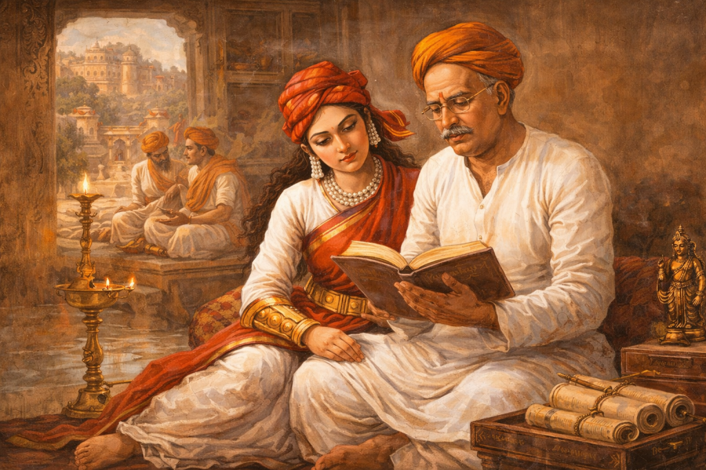 Manikarnika was raised in a Marathi Brahmin household. Her father, Moropant Tambe, was associated with administrative circles which exposed her to political discussion and civic life. The family valued learning — she was taught reading, writing, stories from the epics, and gained an early understanding of governance and duty.